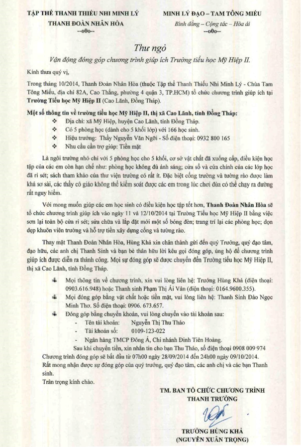 Xin gửi đến quý Mạnh thường quân, bạn bè thân hữu, đoàn sinh thư ngỏ vận động giúp ích Trường tiểu học Mỹ Hiệp II