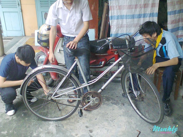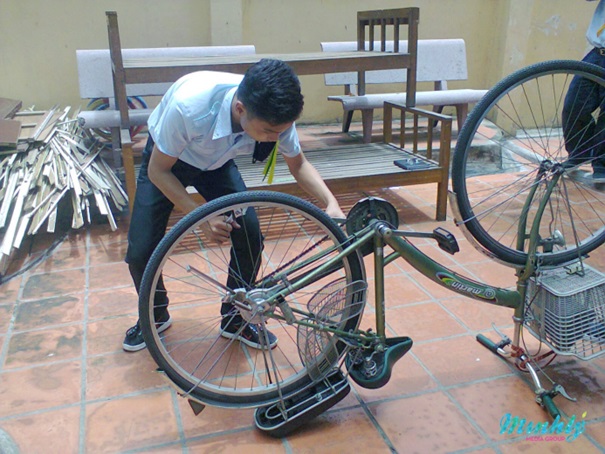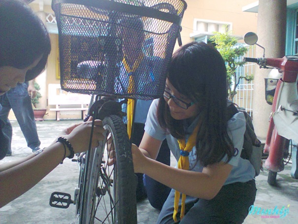 Một số hình ảnh của Thiếu Đoàn Minh Lý khi tham gia buổi học về sửa xe đạp...