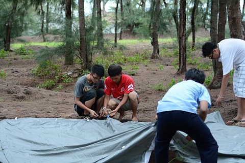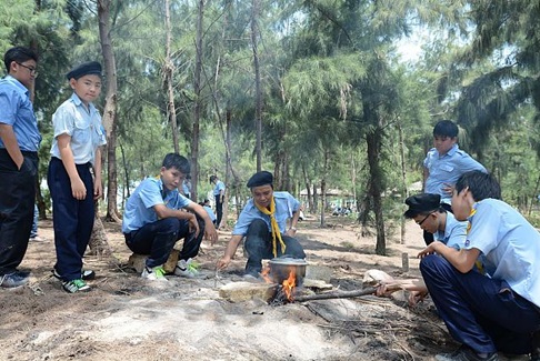 Lúc mới vào trại, em cảm thấy bất ngờ vì vị trí cắm trại ở sát bờ biển và đất trại toàn là cát. Em rất thích vị trí này vì em có thể nhìn ra ngoài biển. Cho dù vậy em thấy khó khăn nhất là phần nấu ăn.