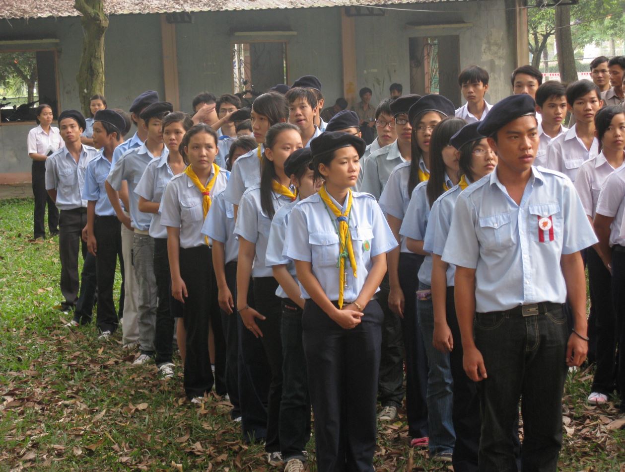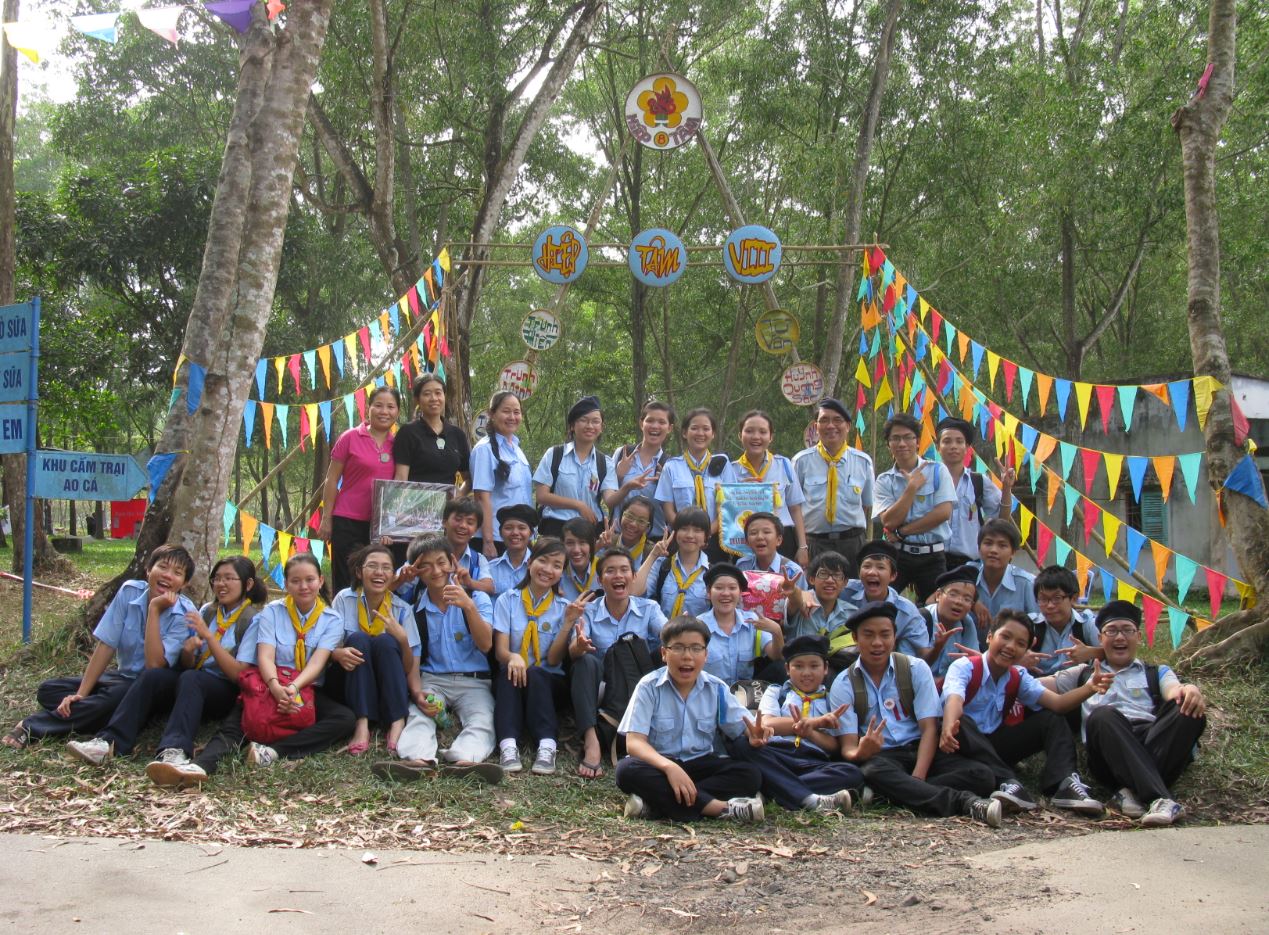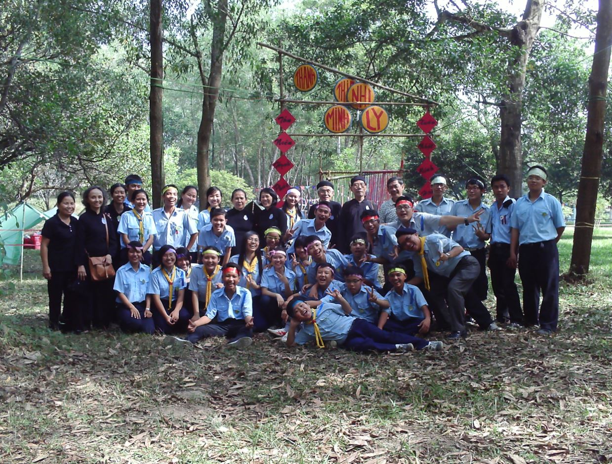 Tập thể Thanh thiếu nhi Minh Lý chụp hình lưu niệm tại cổng Tiểu Trại